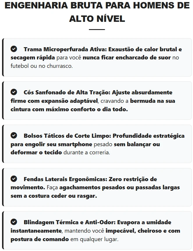 Esqueça bermudas fracas que rasgam no primeiro movimento. A Bermuda Kratos é forjada em poliéster de alta tenacidade e elastano, garantindo conforto extremo e mobilidade absoluta. O corte anatômico impõe respeito imediato, deixando qualquer mulher impressionada com sua postura e elegância masculina.