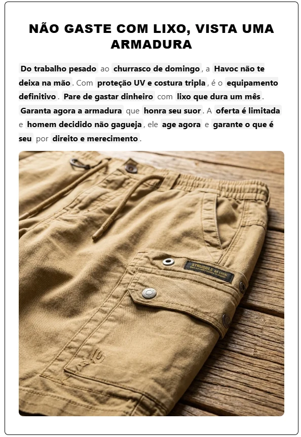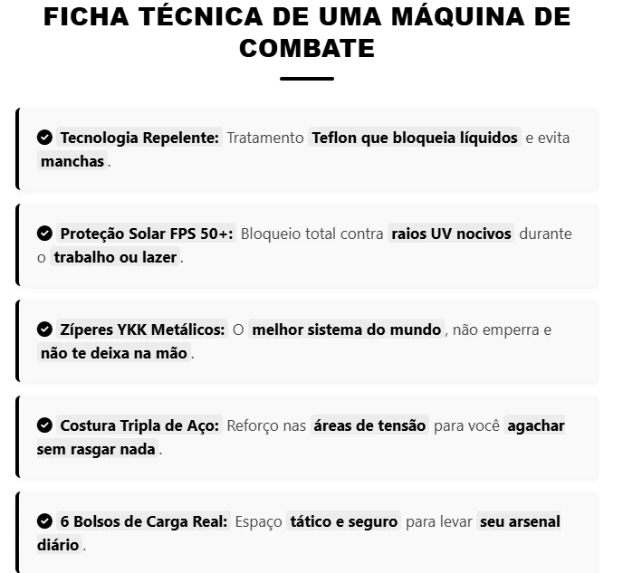 Esqueça roupa fraca que mancha com qualquer pingo de cerveja. A Havoc tem tecnologia de blindagem que repele água e sujeira na hora. Feita com tecido ripstop de elite, ela aguenta o tranco pesado sem abrir o bico. É engenharia militar para quem exige respeito e não aceita peça descartável.