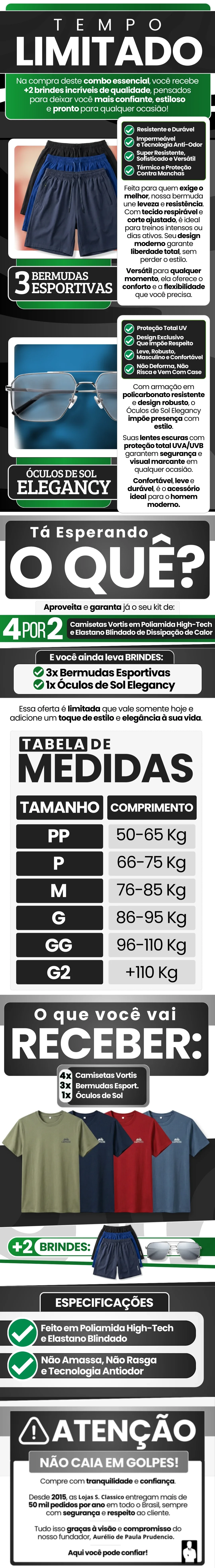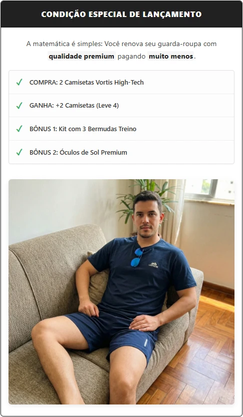 Do escritório ao treino de alta performance, do futebol com os amigos ao compromisso casual. A Camiseta Vortis foi desenhada para o homem que domina múltiplos ambientes. Seu design minimalista e acabamento premium garantem que você esteja sempre bem vestido, transmitindo uma imagem de sucesso e autoconfiança.