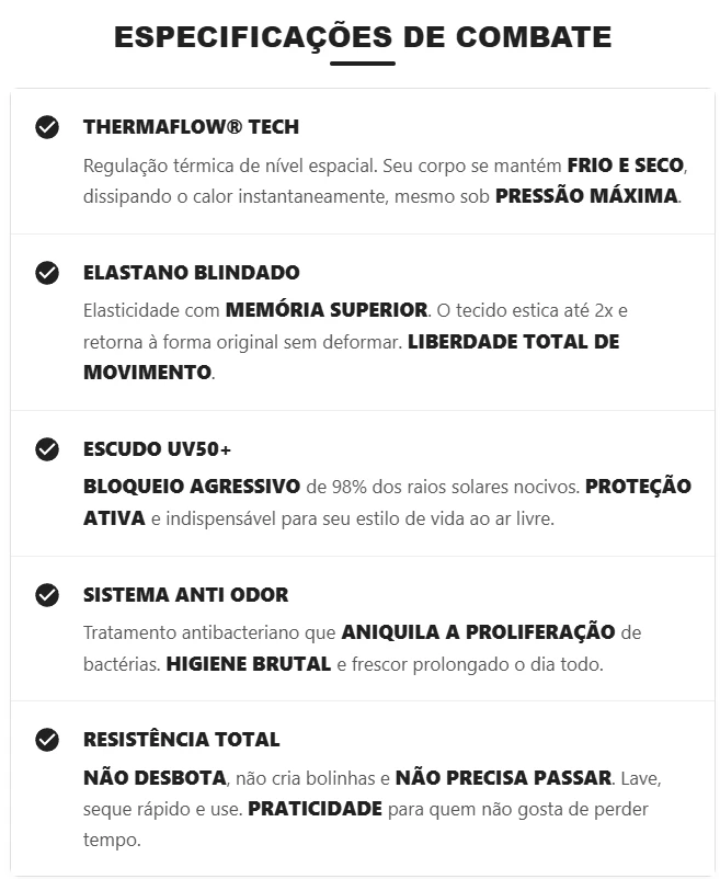 Esqueça o algodão básico que encharca e pesa. A Vortis utiliza a tecnologia Outperform™, inspirada em trajes de astronautas. Microcápsulas inteligentes absorvem e liberam o calor corporal, criando um microclima estável na pele. É a fusão definitiva entre a resistência de um equipamento tático e o conforto de uma segunda pele.
